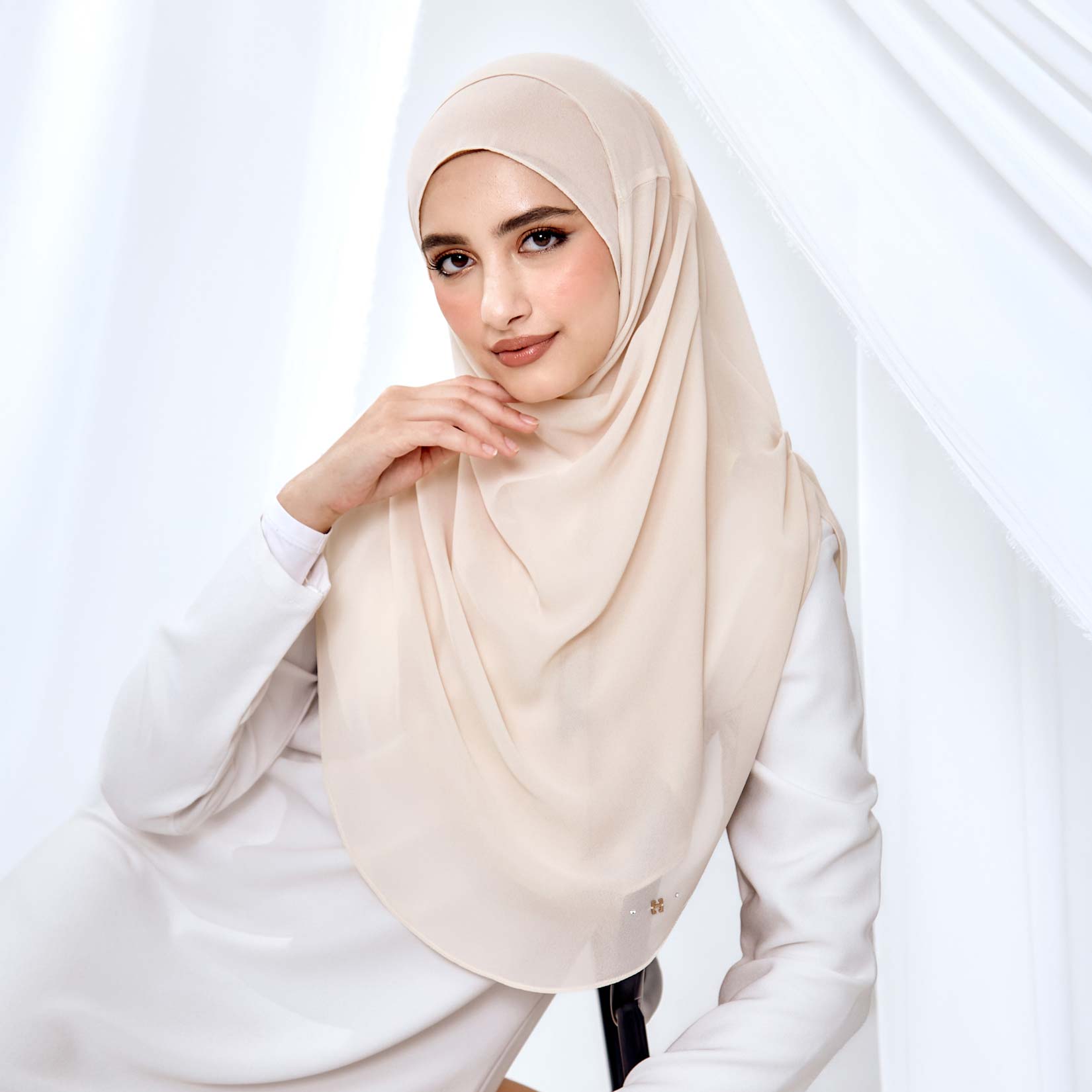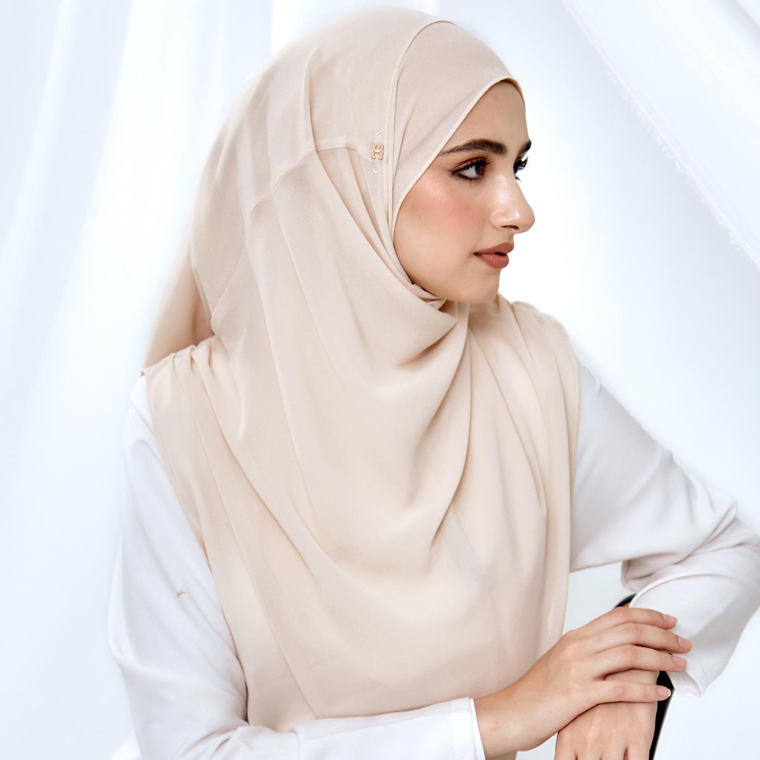 • DetailsIt comes with a pair of our H pendant. This hijab as pleat at the side (shoulder)There are 2 layers made of Premium Heavy Chiffon to ensure the hijab is not see-through.