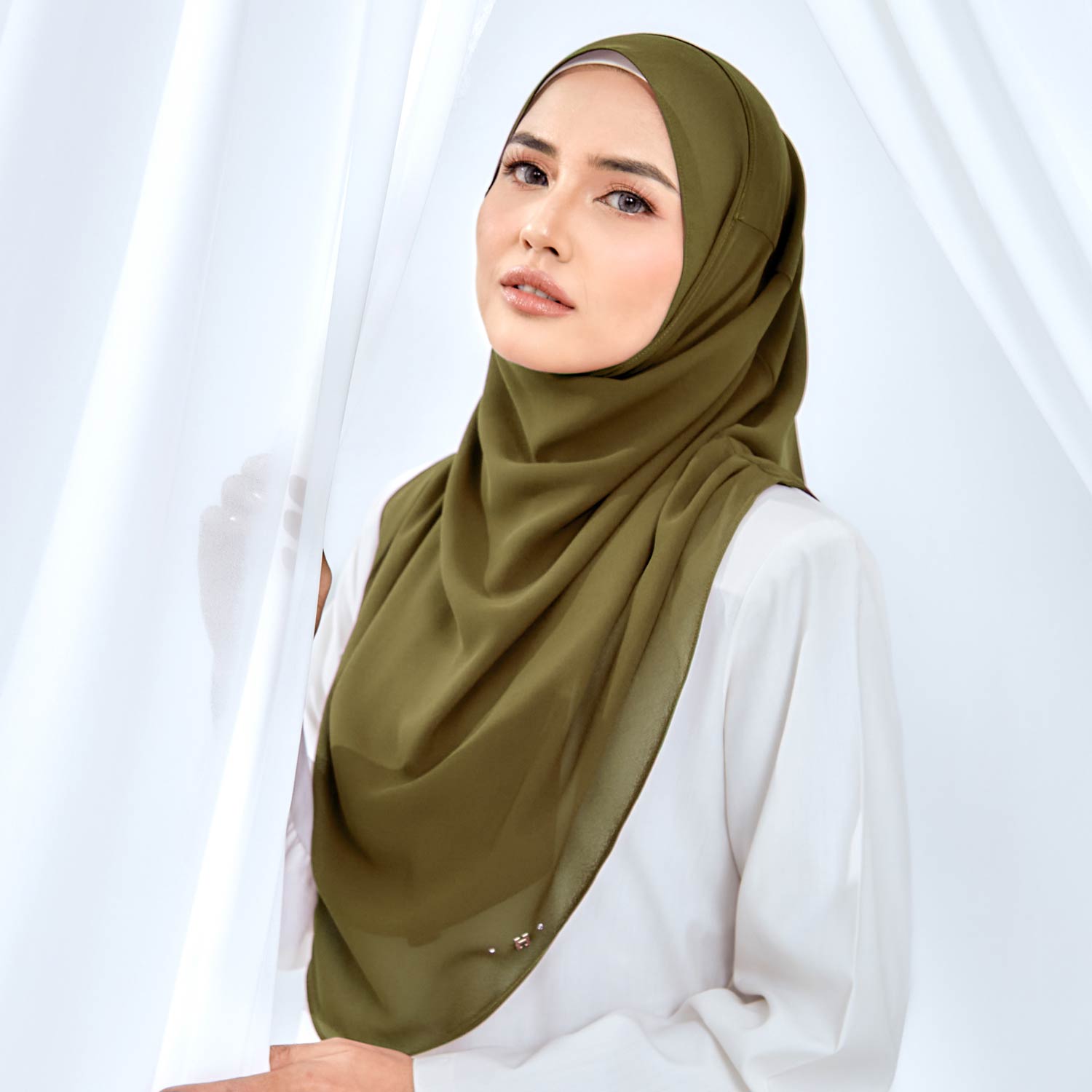 • DetailsIt comes with a pair of our H pendant. This hijab as pleat at the side (shoulder)There are 2 layers made of Premium Heavy Chiffon to ensure the hijab is not see-through.