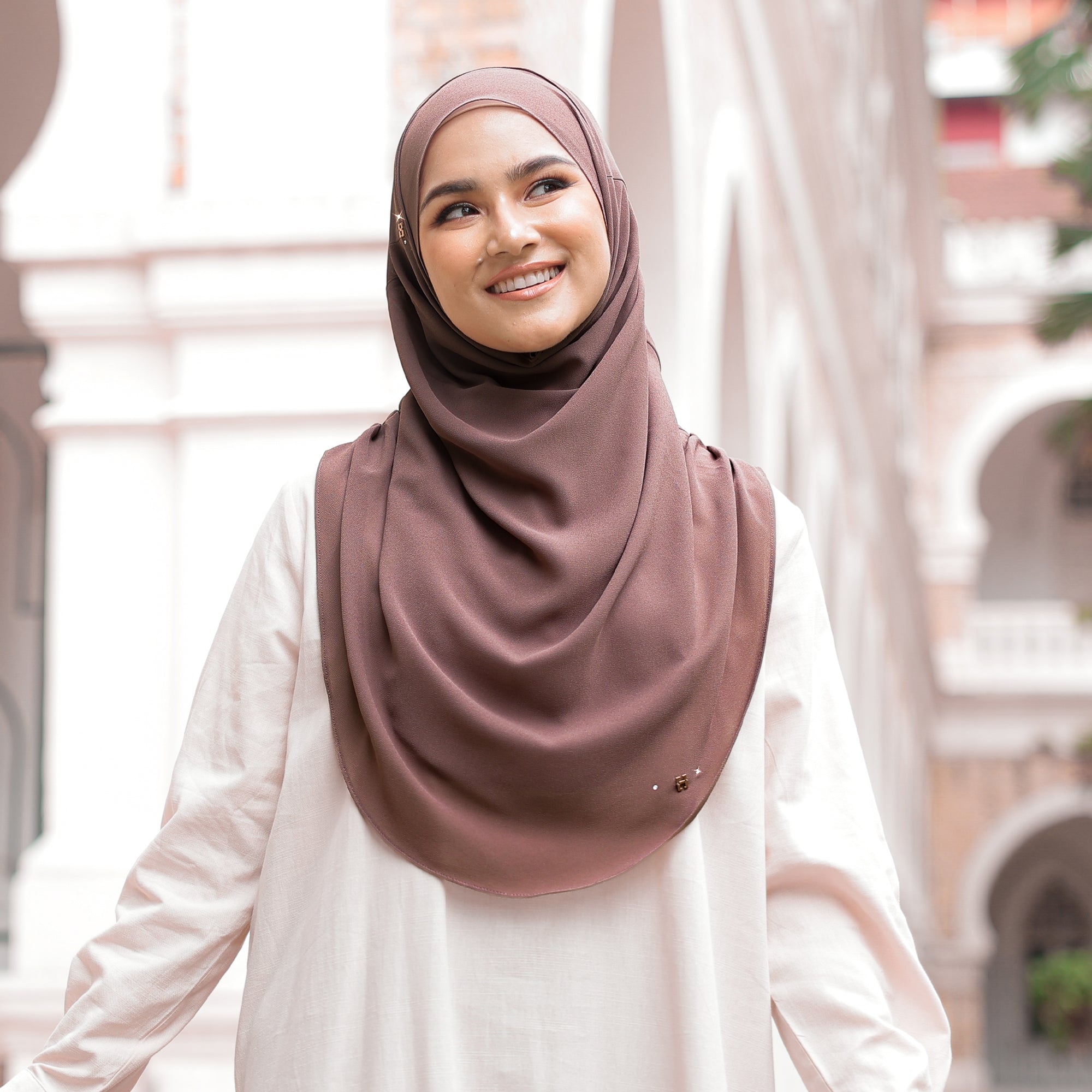 • Details: It comes with a pair of our H pendant. This hijab as pleat at the side (shoulder). There are 2 layers made of Premium Heavy Chiffon to ensure the hijab is not see-through.
