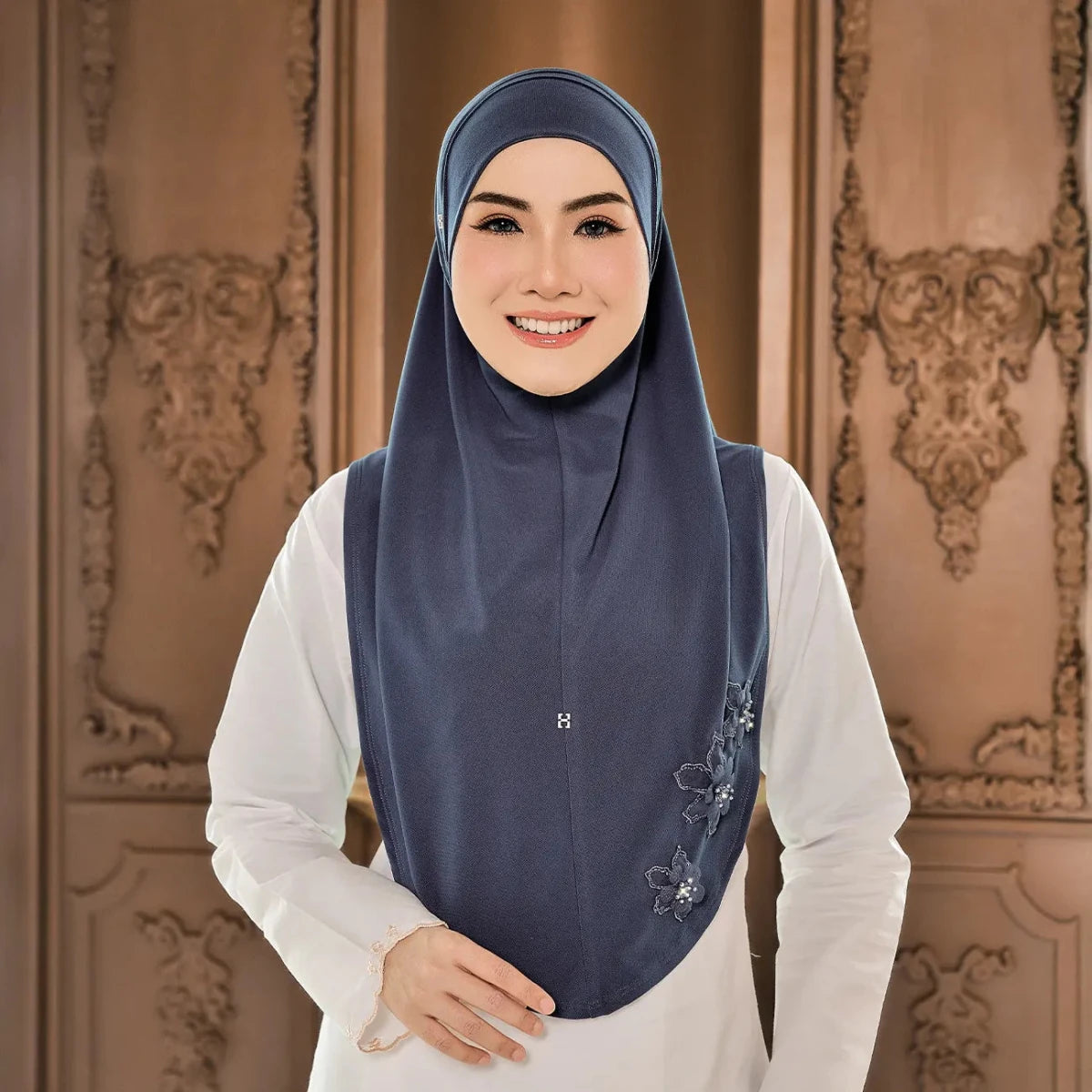 Theme: Brings a touch of sophistication to everyday elegance. Each hijab features carefully arranged 3D floral appliques, delicate embroidery, and sparkling crystals that create a dimensional, luxurious look.