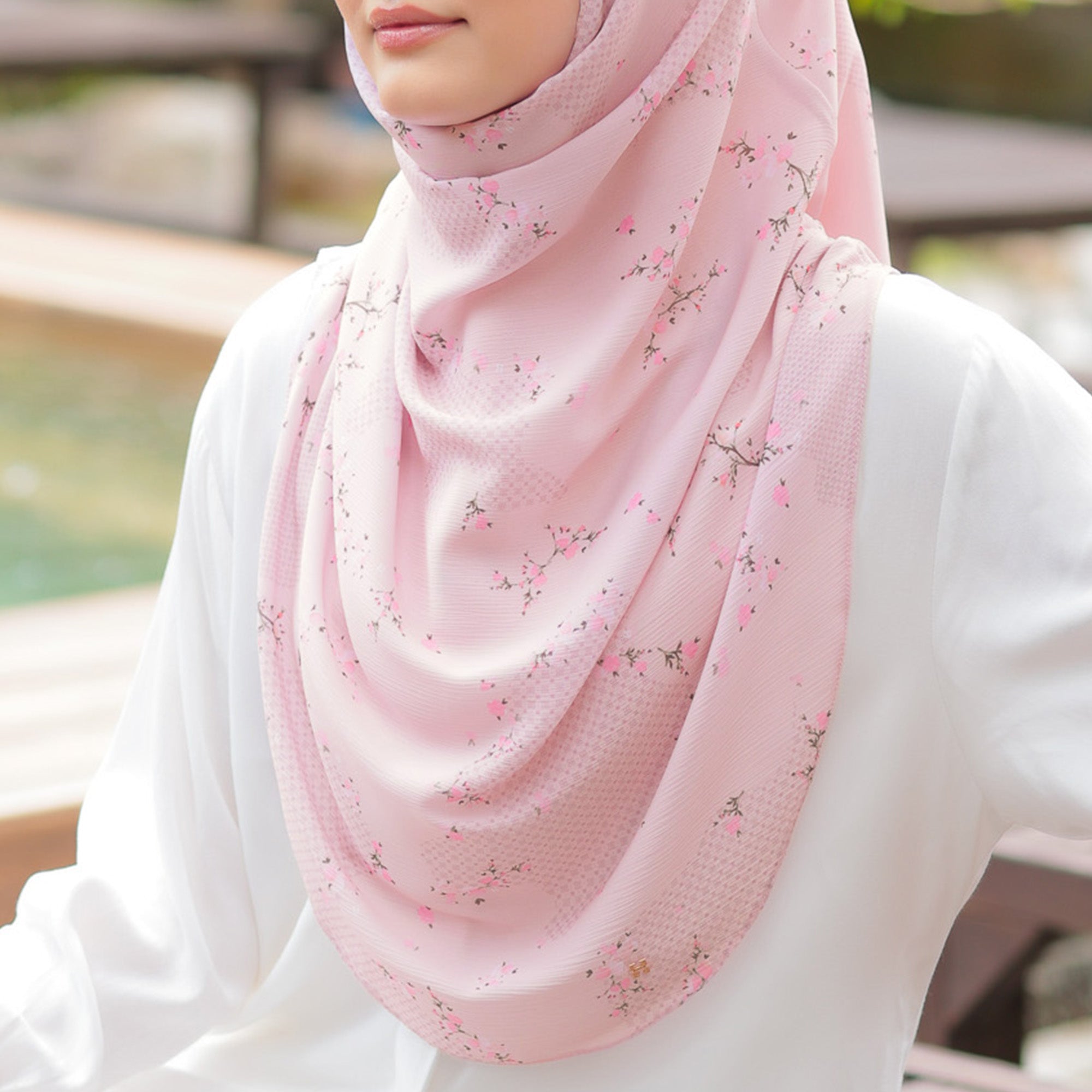 The hijab has pleats on the side (shoulder) and comes in Cutting options for LOT 1. The textured chiffon also means *Very Minimal* ironing (yay!)