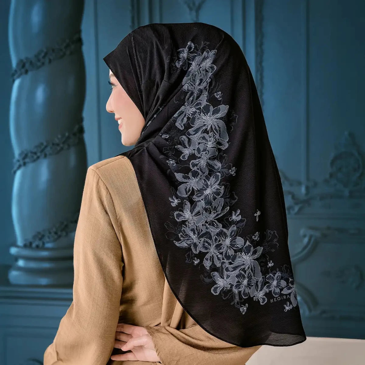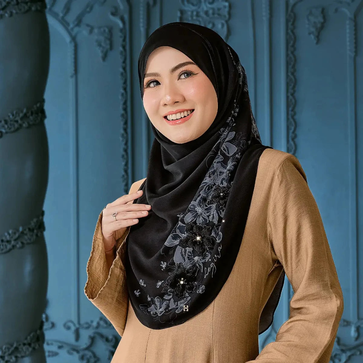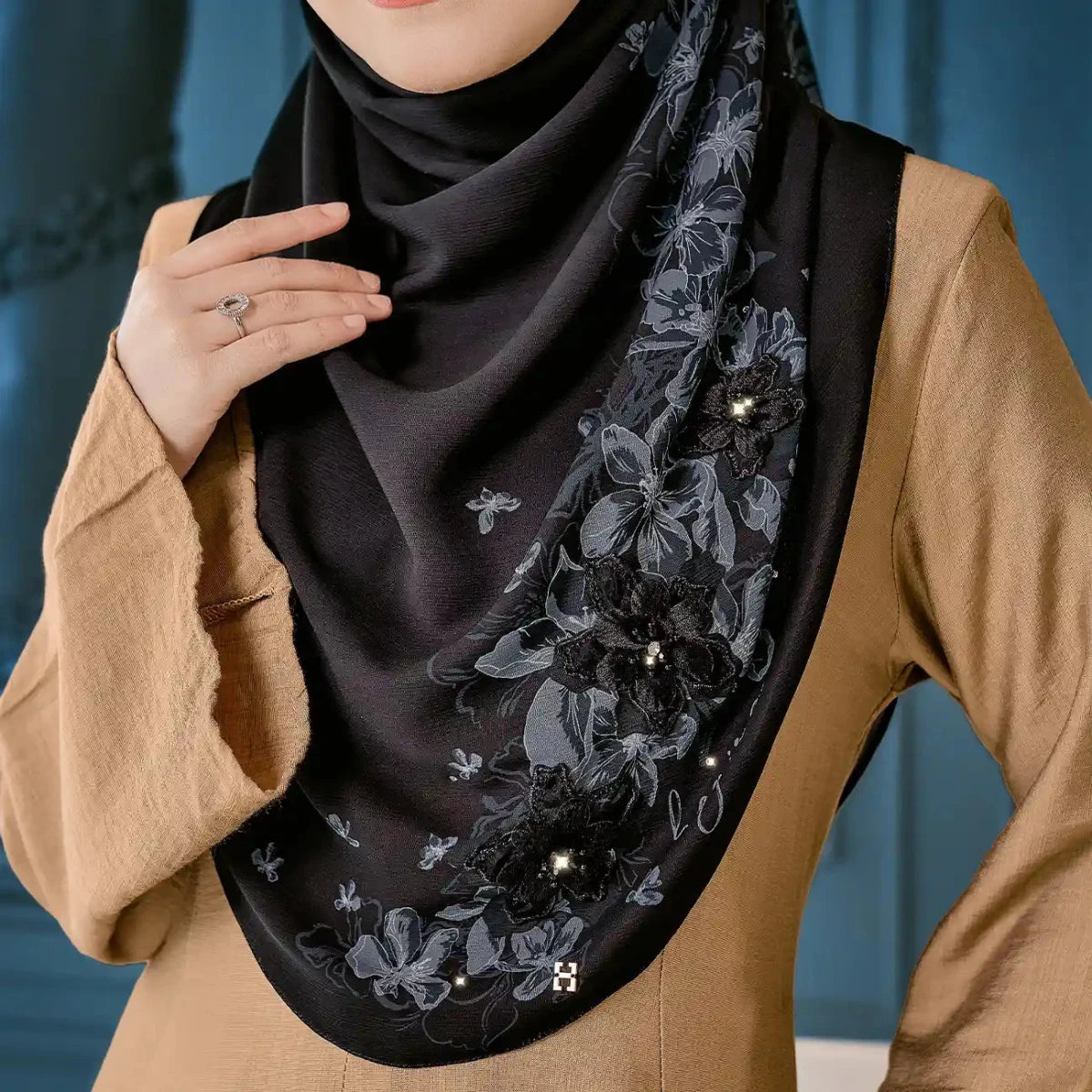 • Themes: Brings a touch of sophistication to everyday elegance. Each hijab features carefully arranged 3D floral appliques, delicate embroidery, and sparkling crystals that create a dimensional, luxurious look.