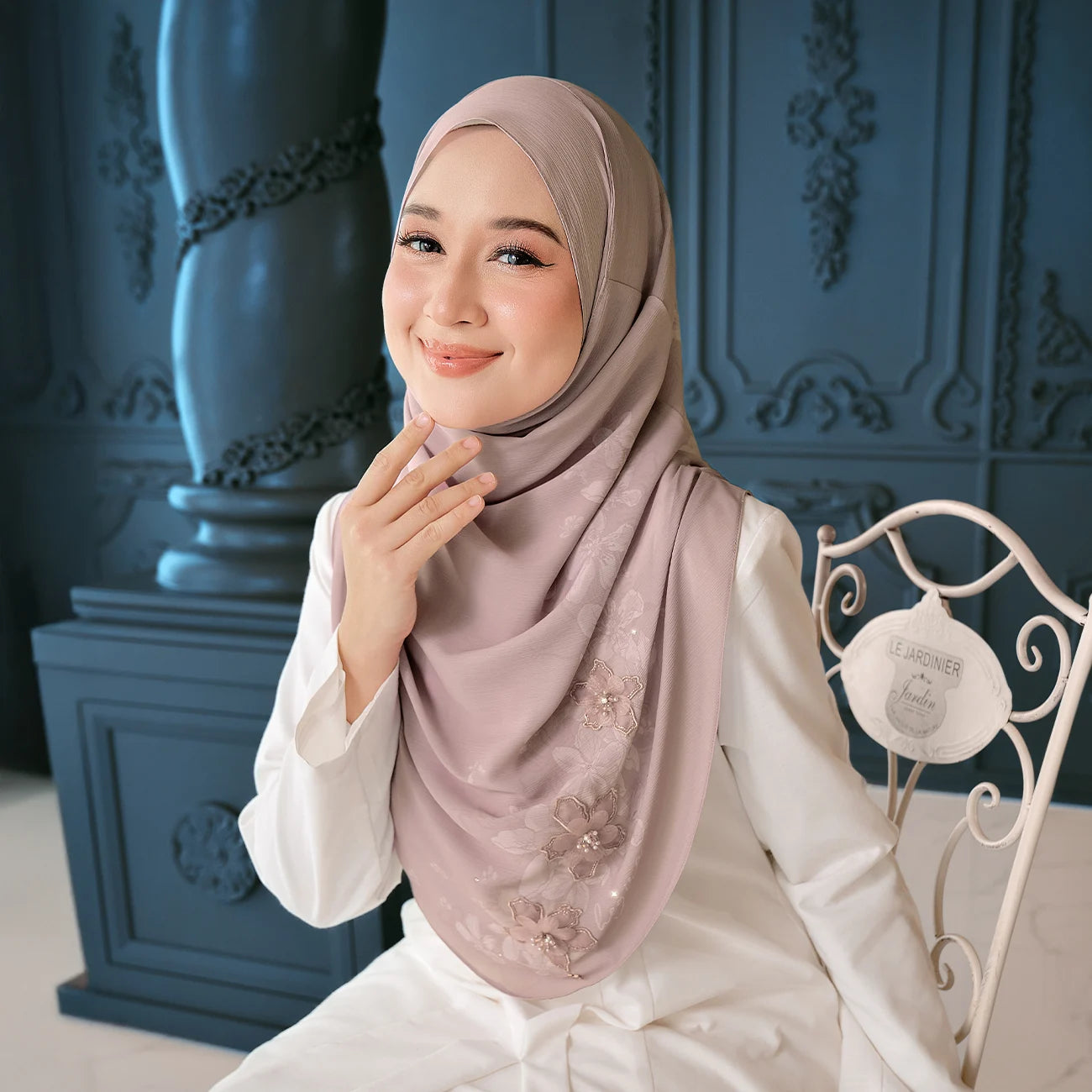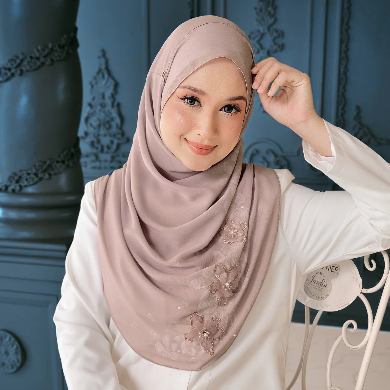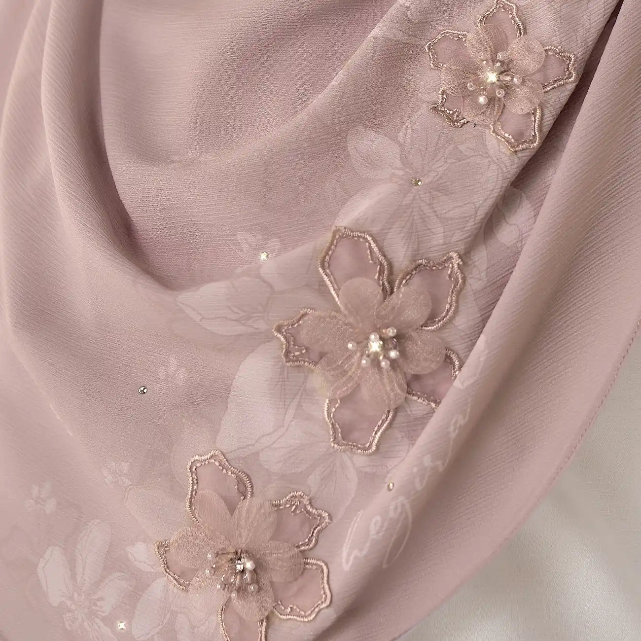 - Themes: Brings a touch of sophistication to everyday elegance. Each hijab features carefully arranged 3D floral appliques, delicate embroidery, and sparkling crystals that create a dimensional, luxurious look.