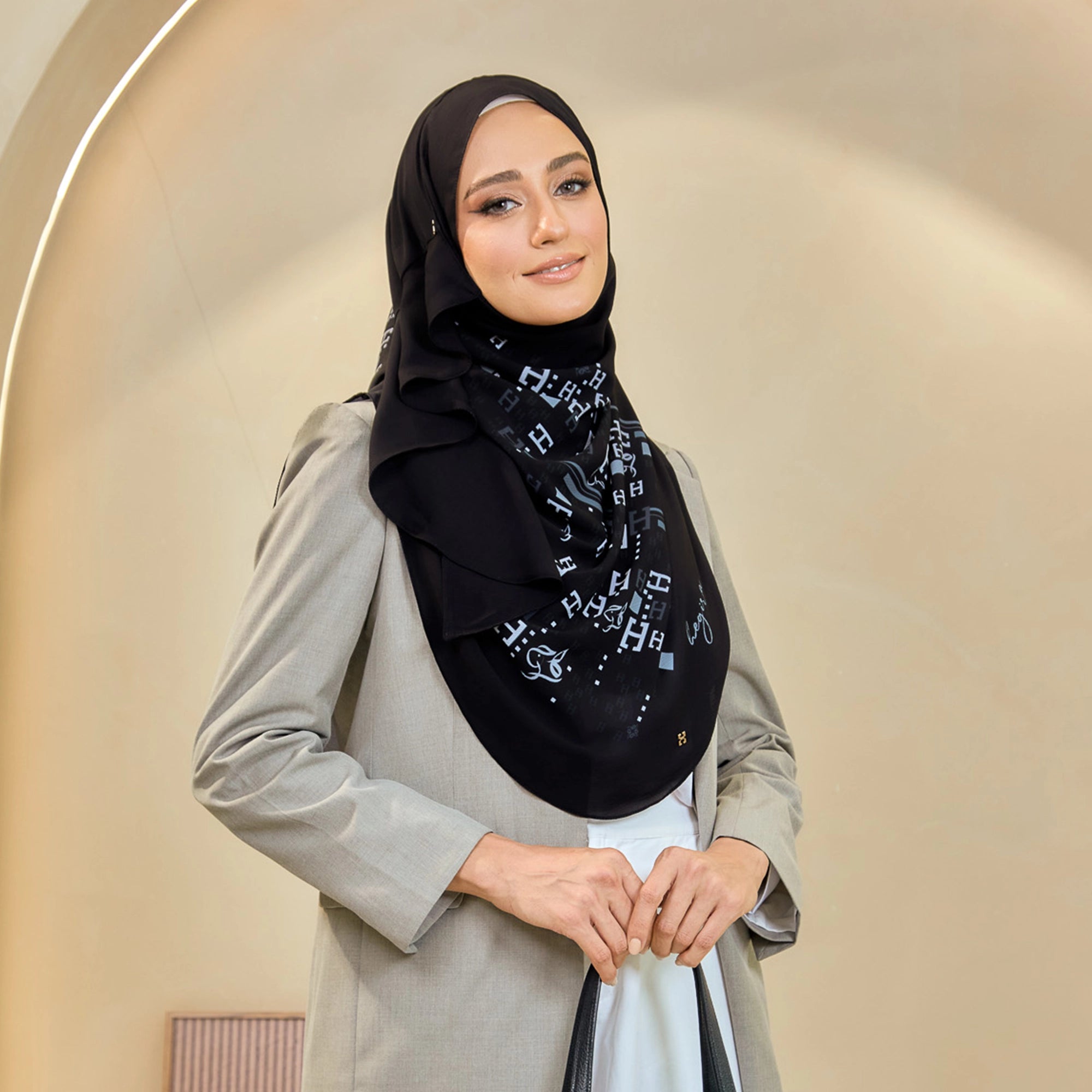 • Themes: A classic monogram hijab with Jawi letters هـ، ج، ر — a touch of heritage in every detail. Made for your busy day, from work to winding down. Stylish, easy and truly you.