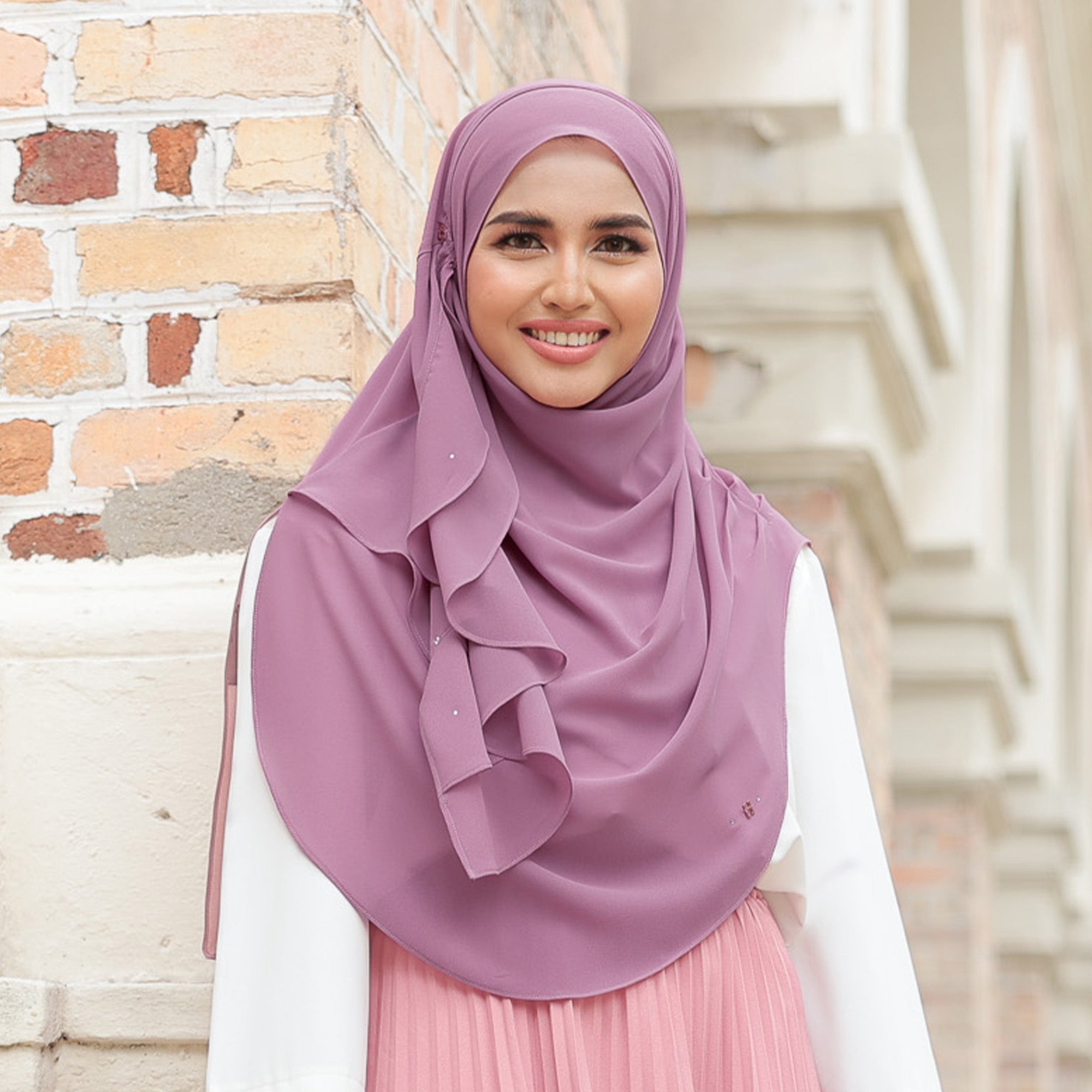 Waverly So is an instant slip-on, with a shawl face look. The name is inspired by the wavy ruffles on the side. This hijab is very easy to wear, and the length is nicely modest, front, and back.
