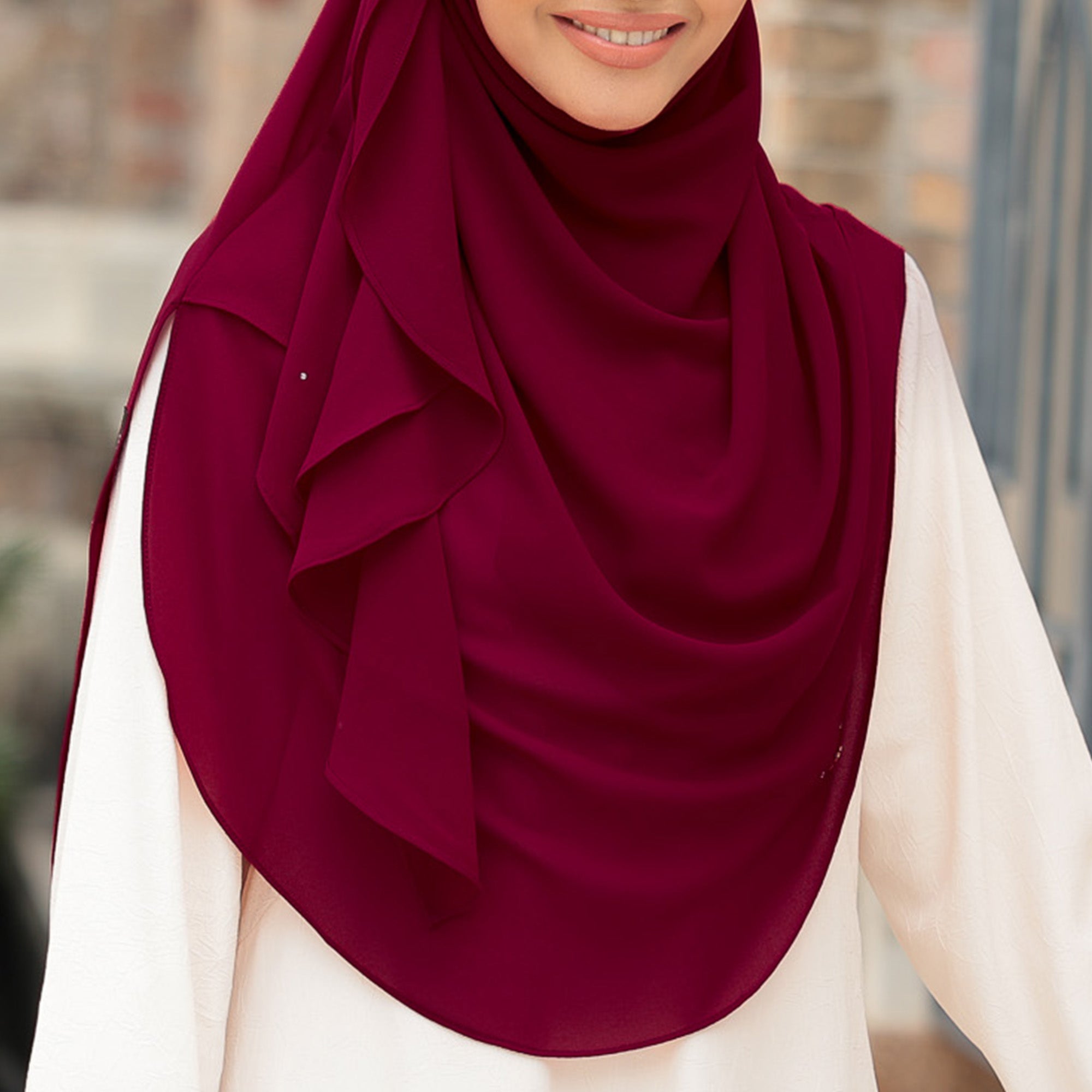 Waverly So is an instant slip-on, with a shawl face look. The name is inspired by the wavy ruffles on the side. This hijab is very easy to wear, and the length is nicely modest, front, and back.