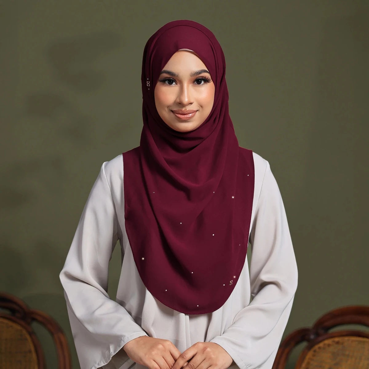 Meet Catalyna-So, our latest addition, a plain hijab subtly enhanced with fine cut crystals. Designed for those who appreciate minimal sophistication, it adds a polished and refined touch to any festive wardrobe. A timeless piece that elevates your Raya look effortlessly.