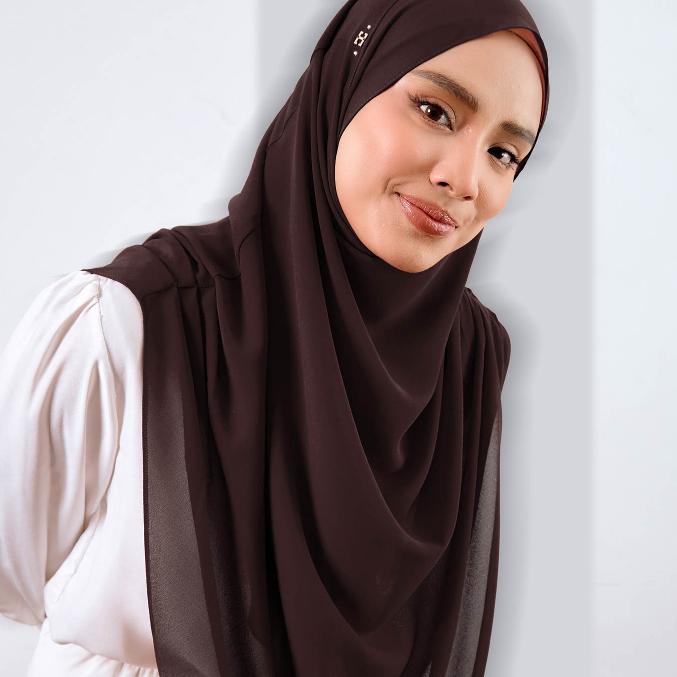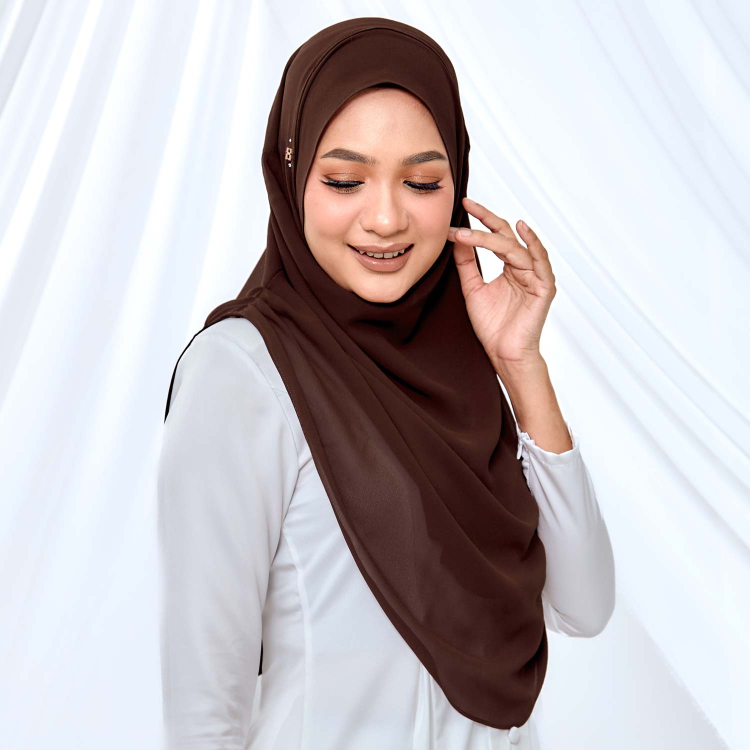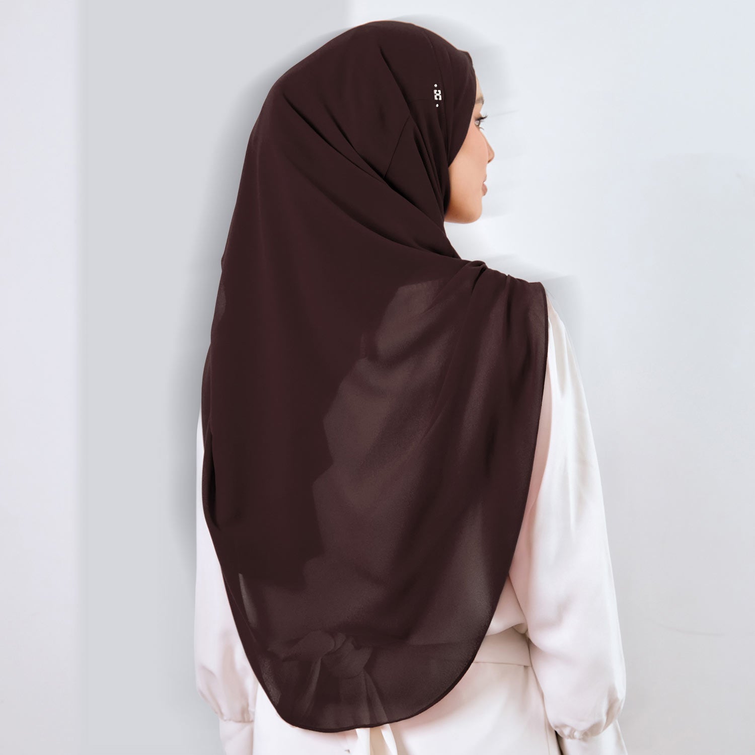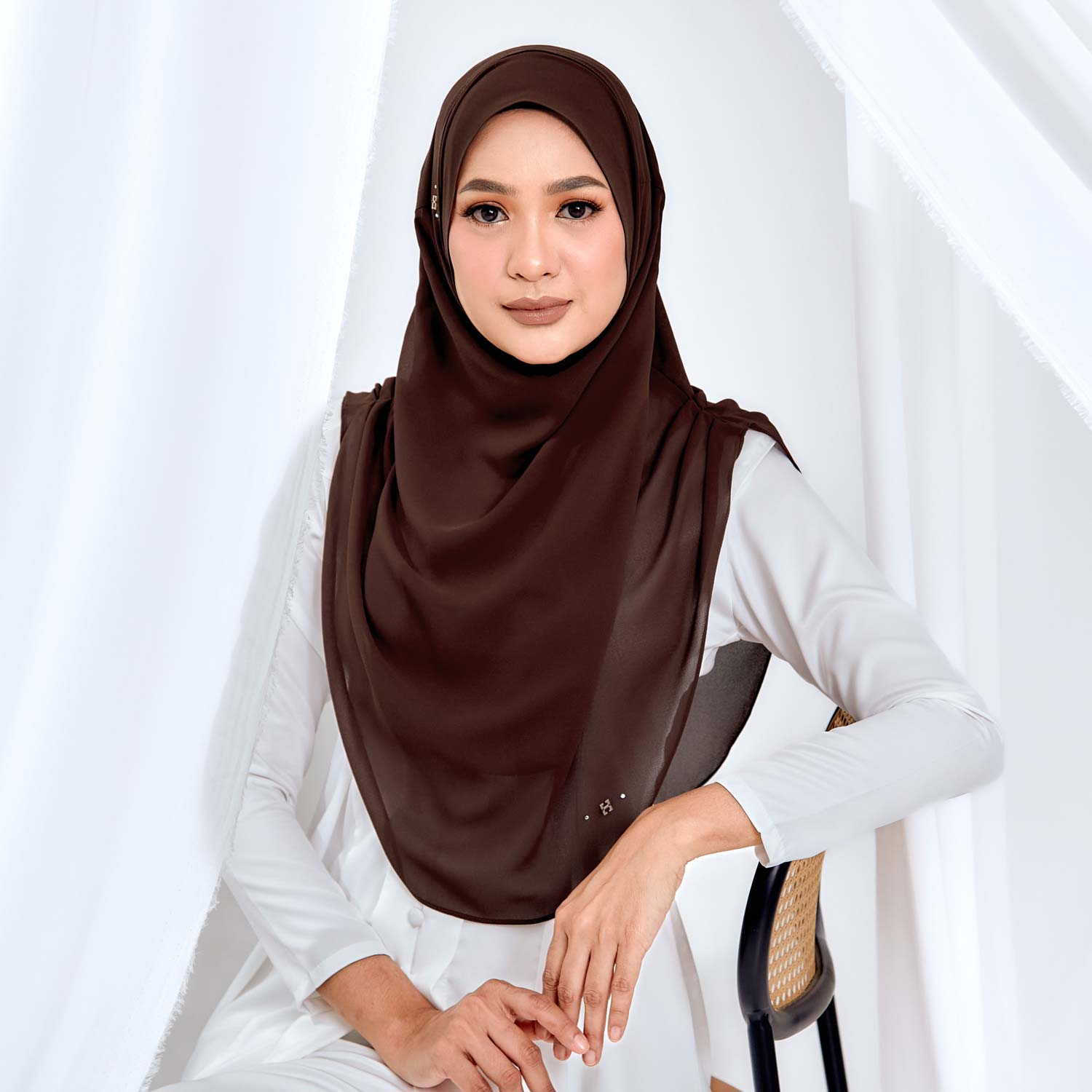 • DetailsIt comes with a pair of our H pendant. This hijab as pleat at the side (shoulder)There are 2 layers made of Premium Heavy Chiffon to ensure the hijab is not see-through.