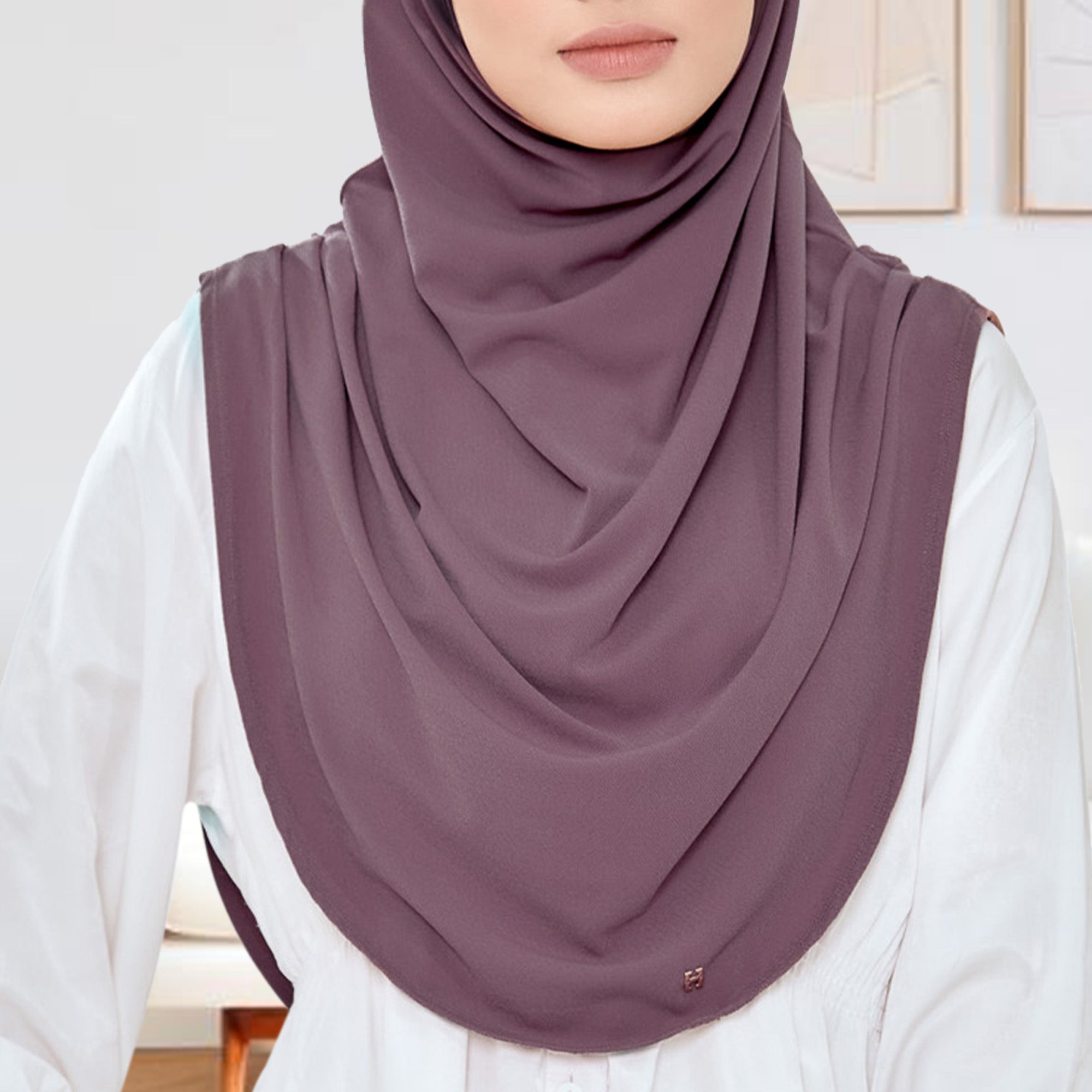 Details:  Adorned with a pair of H rose gold pendants. The hijab has pleat at the side (shoulder)