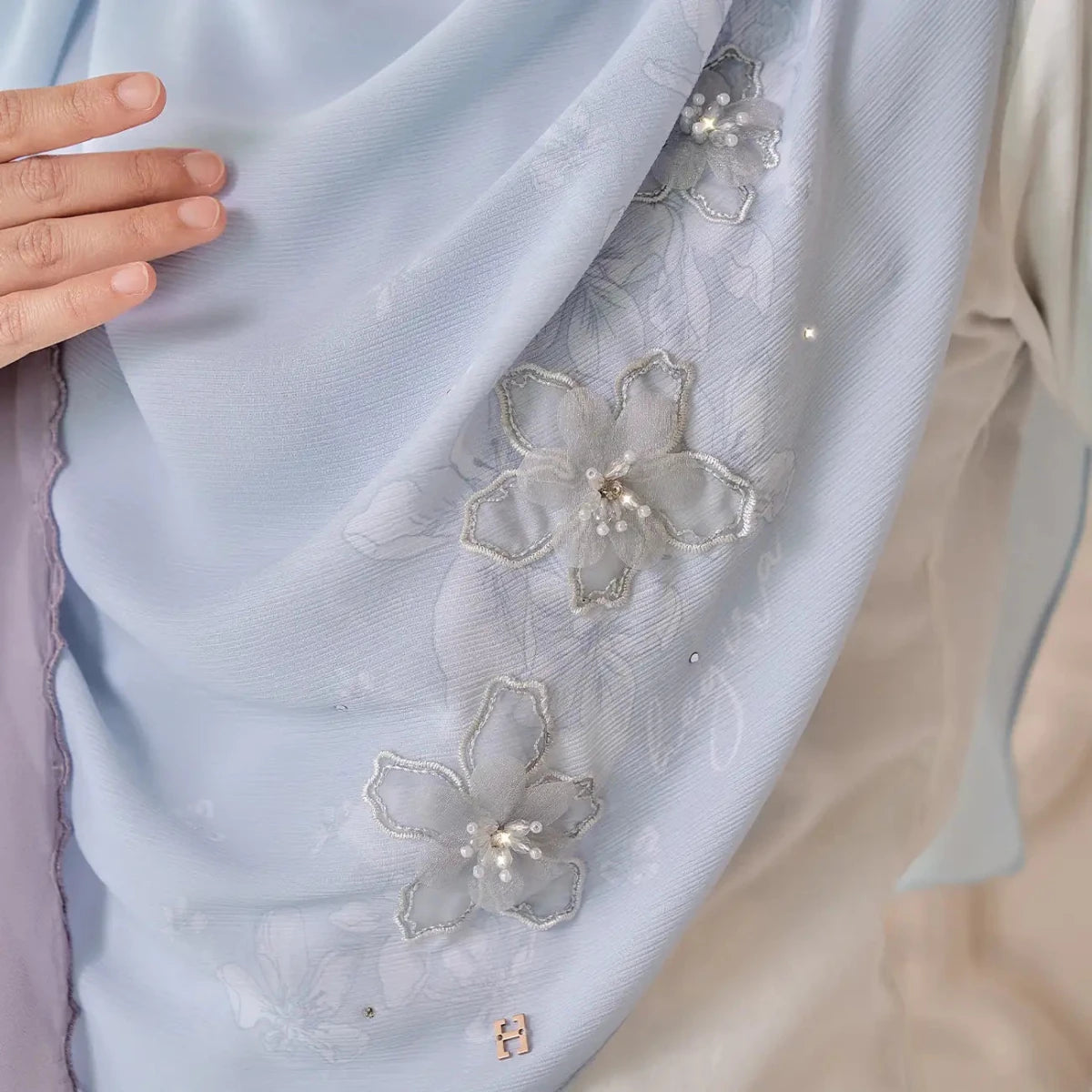 • Themes: Brings a touch of sophistication to everyday elegance. Each hijab features carefully arranged 3D floral appliques, delicate embroidery, and sparkling crystals that create a dimensional, luxurious look.
