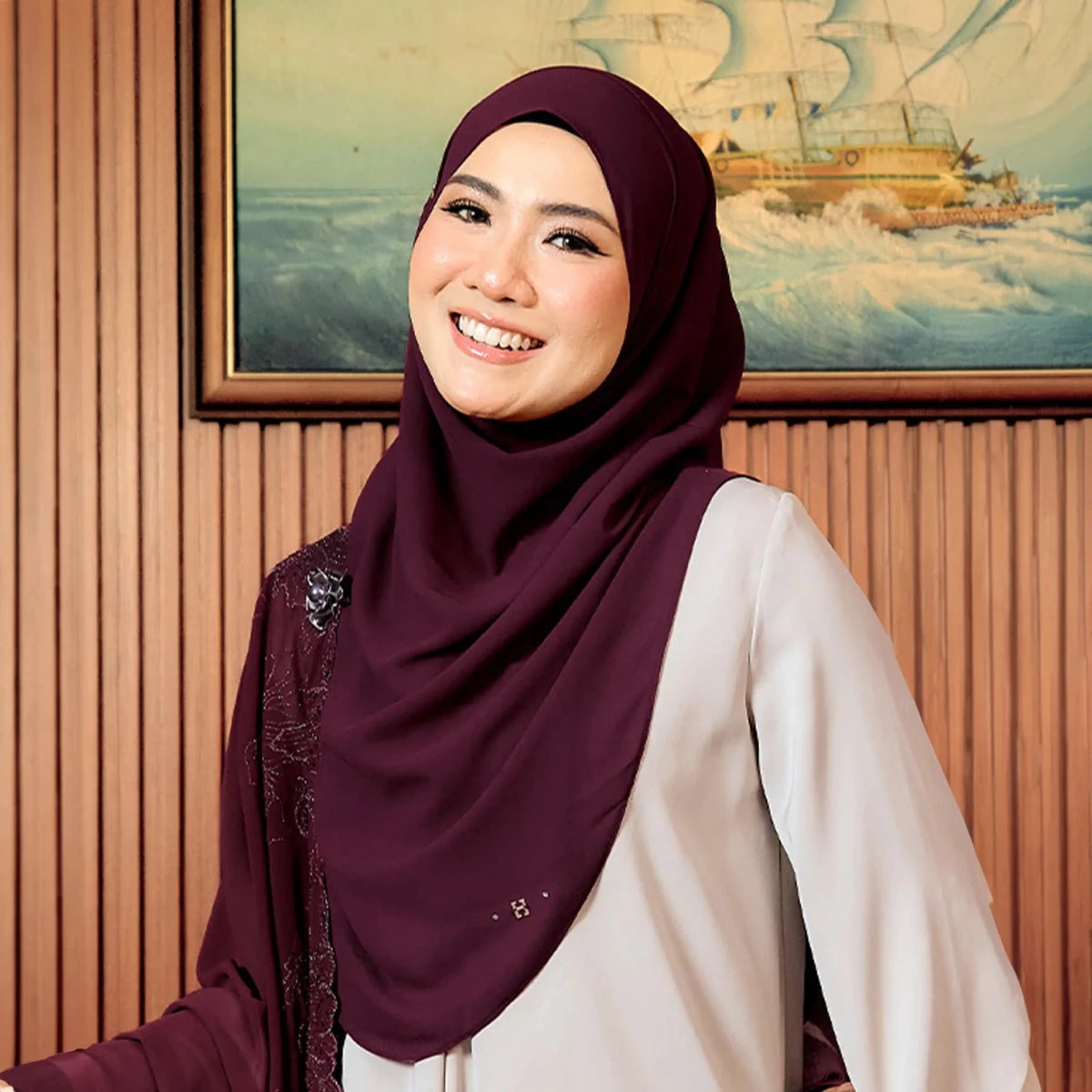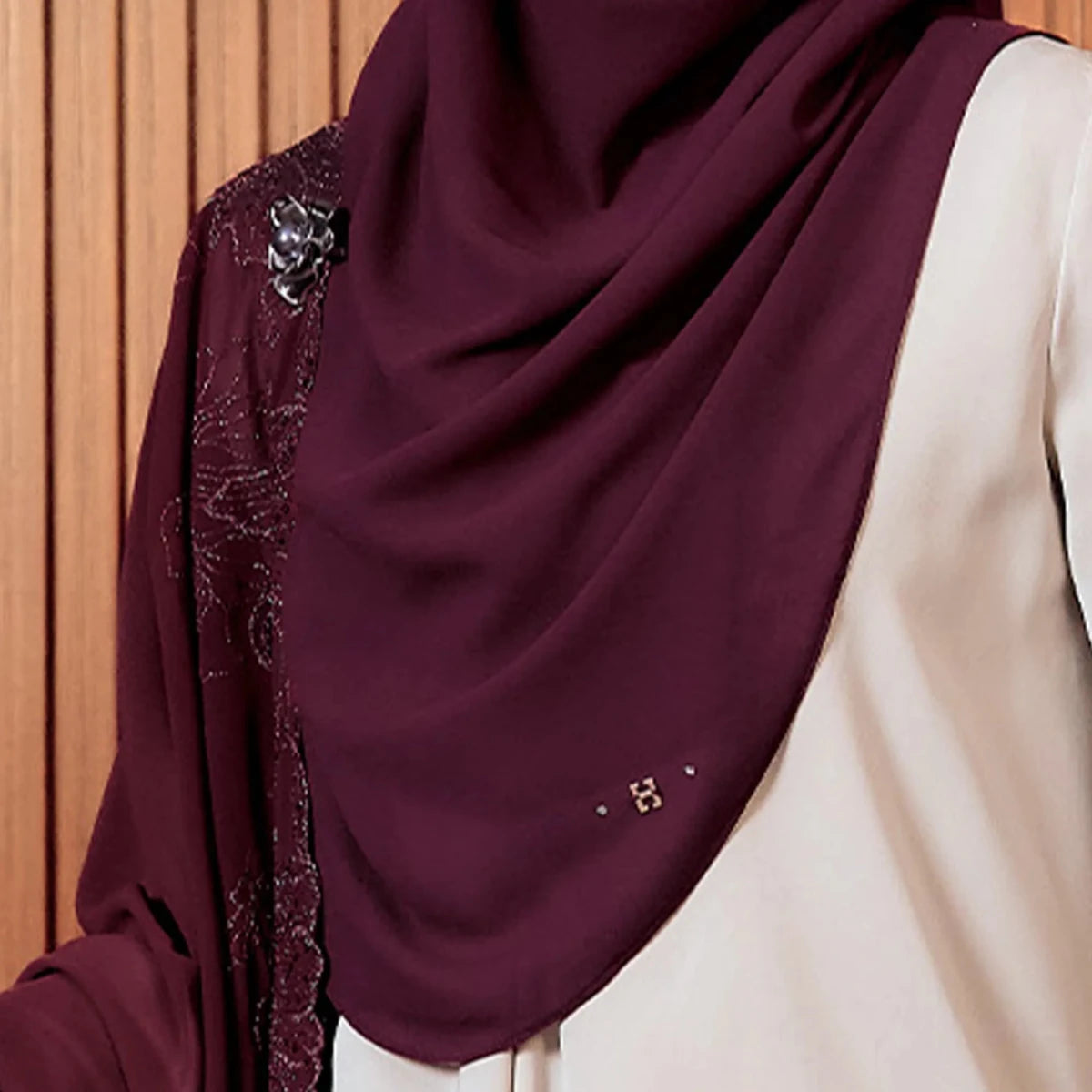 • Details: It comes with a pair of our H pendant. This hijab as pleat at the side (shoulder). There are 2 layers made of Premium Heavy Chiffon to ensure the hijab is not see-through.