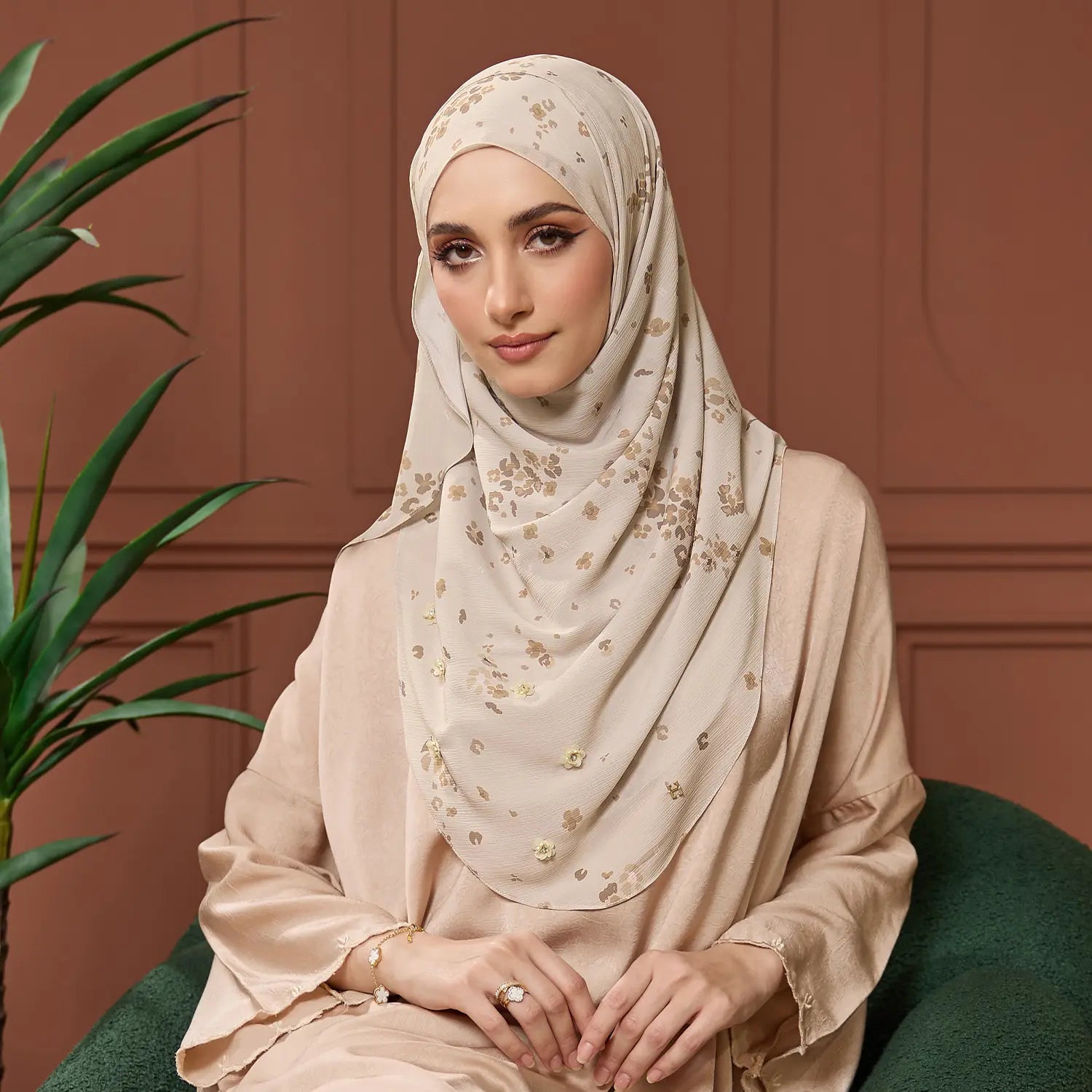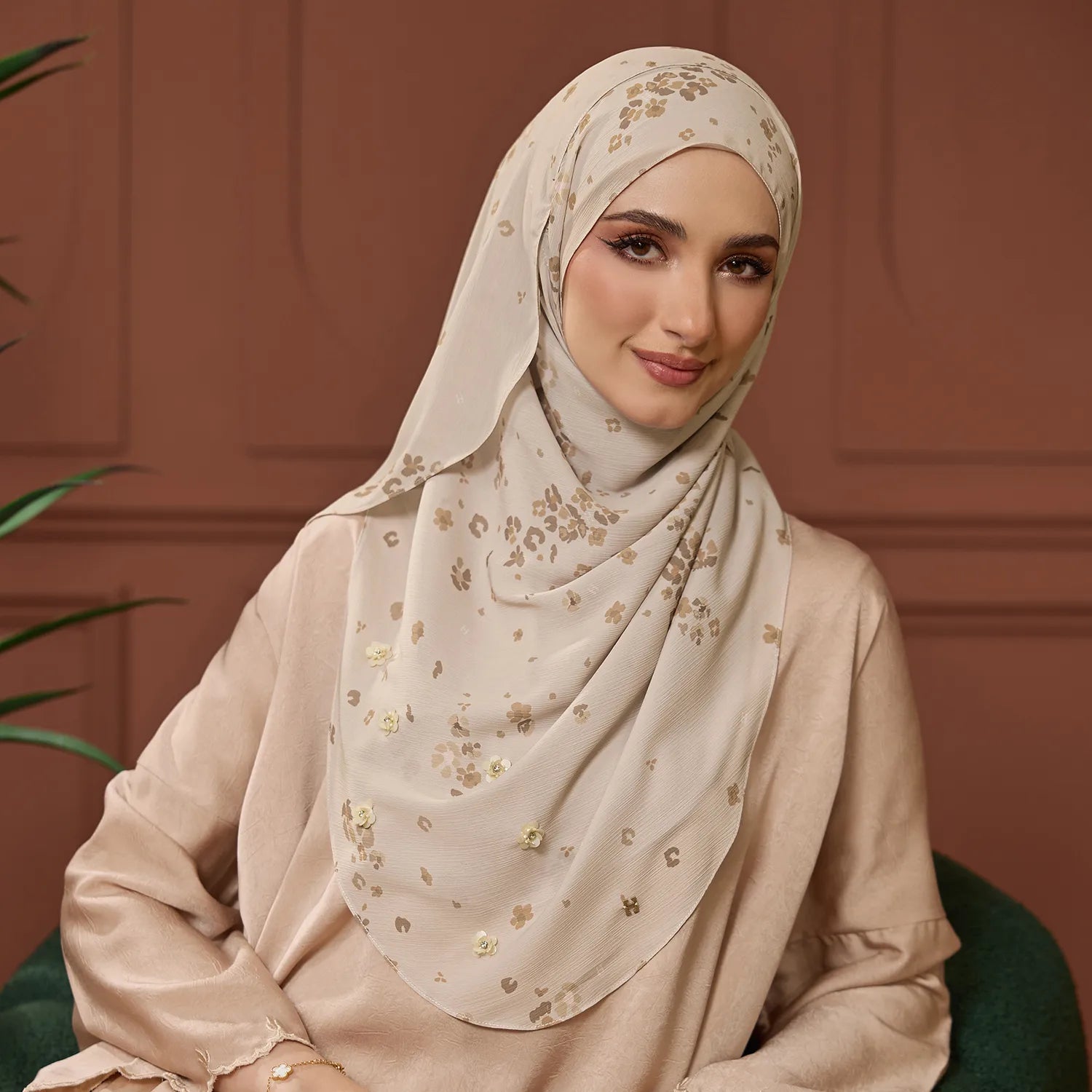 Theme: Brings a touch of sophistication to everyday elegance. Each hijab features carefully arranged 3D floral appliques, delicate embroidery, and sparkling crystals that create a dimensional, luxurious look.