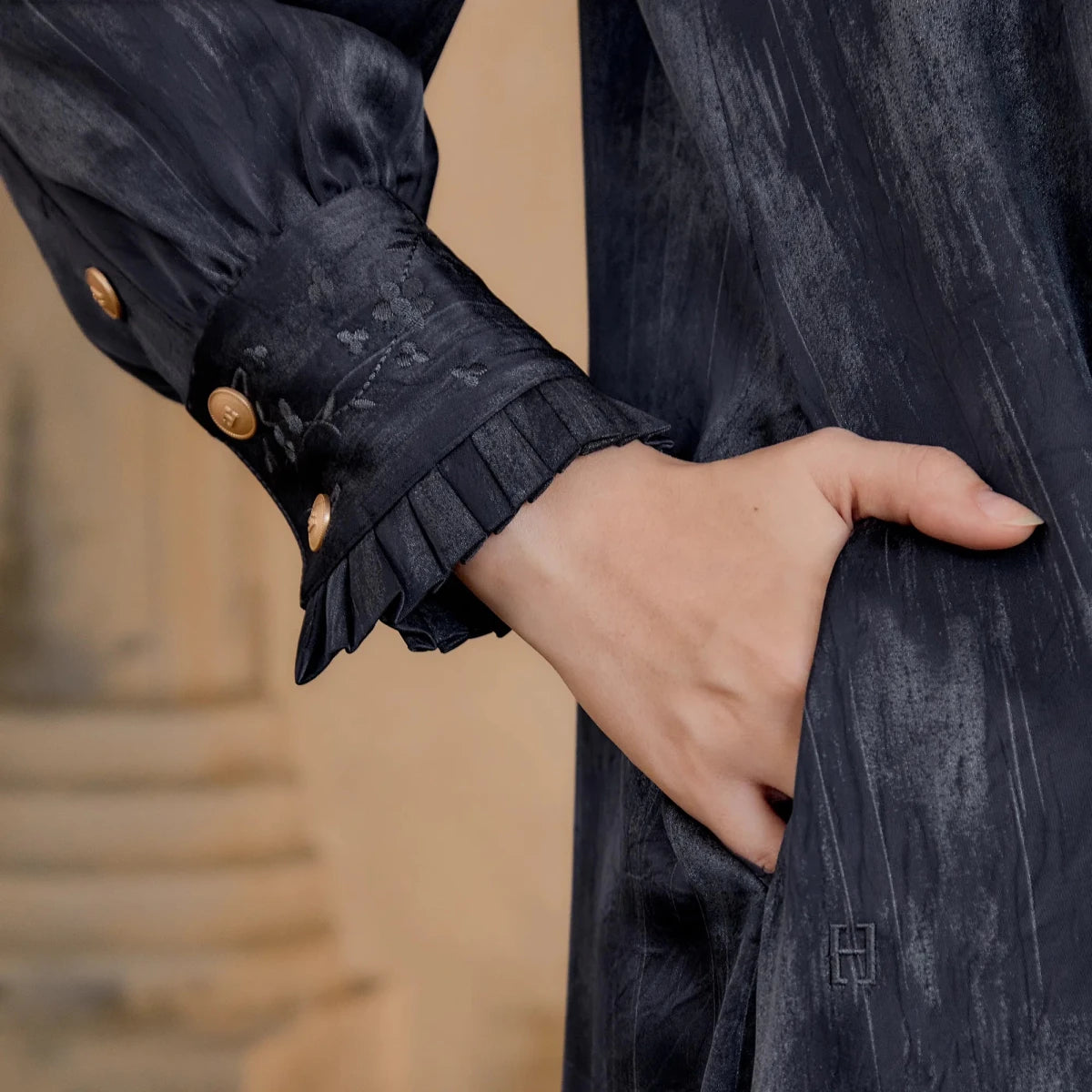 • Embroidered cuffs with three custom buttons for a refined touch