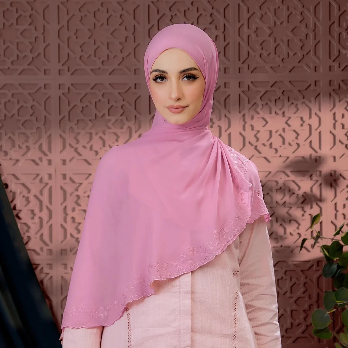 • Style: Half Moon scarf. Delicate embroidery at the curved edge for an elegant, refined finish.