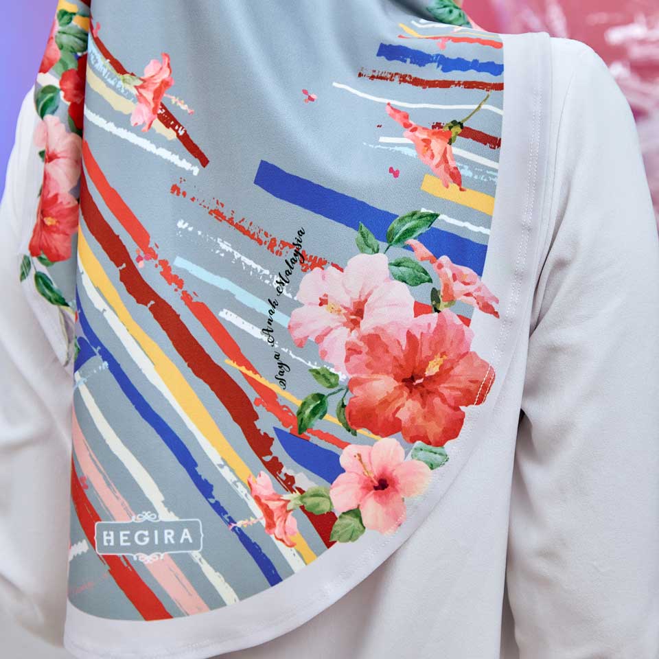 Theme: Warisan is a theme for this hijab’s awning, which is made to match the hijab. It is sweet, simple and has a hint of vintage-feel, adorned with our national flowers, for a little touch of femininity.