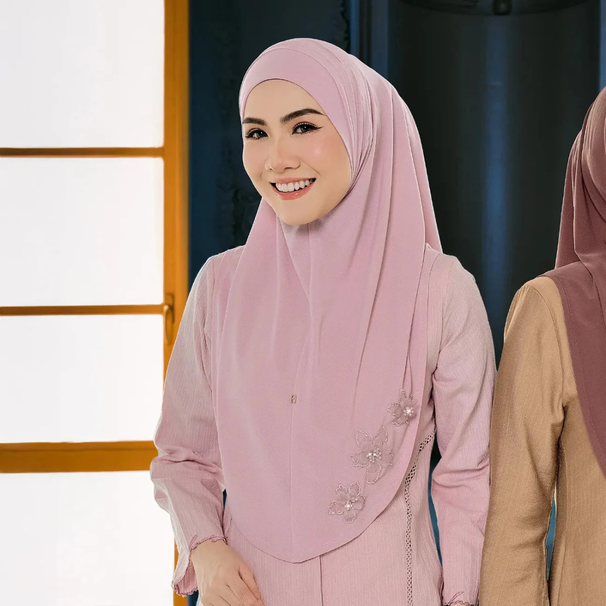 The Hanamina Luxe collection is now available in the So-Marjan Twill NC Luxe design, combining the signature So-Marjan NC silhouette with the luxurious Hanamina detailing, creating a graceful and elevated hijab perfect for Raya.