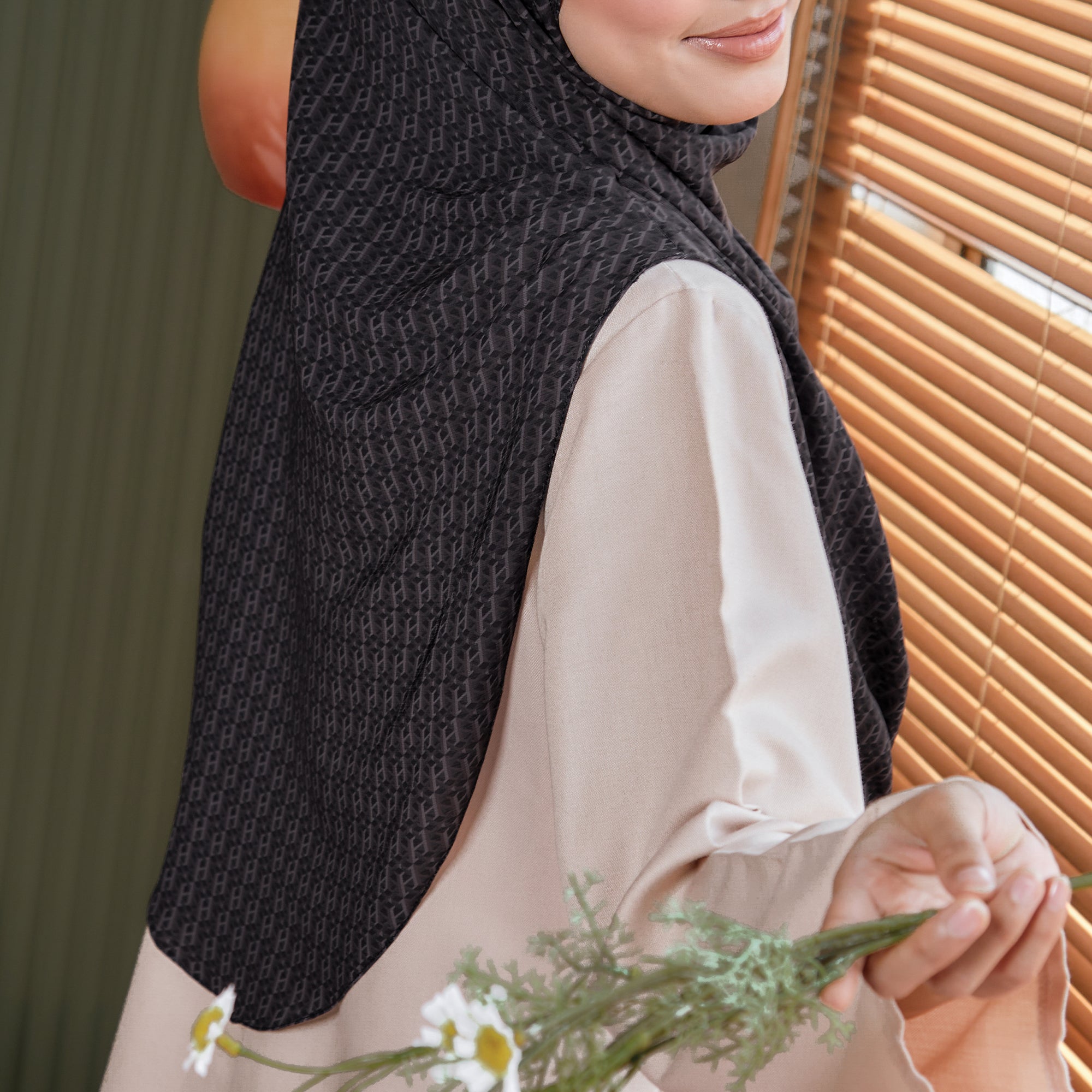Materials: Body & Awning - Custom Printed Textured Chiffon | There is a layer inside made of Premium Heavy Chiffon to ensure the hijab is not see-through.