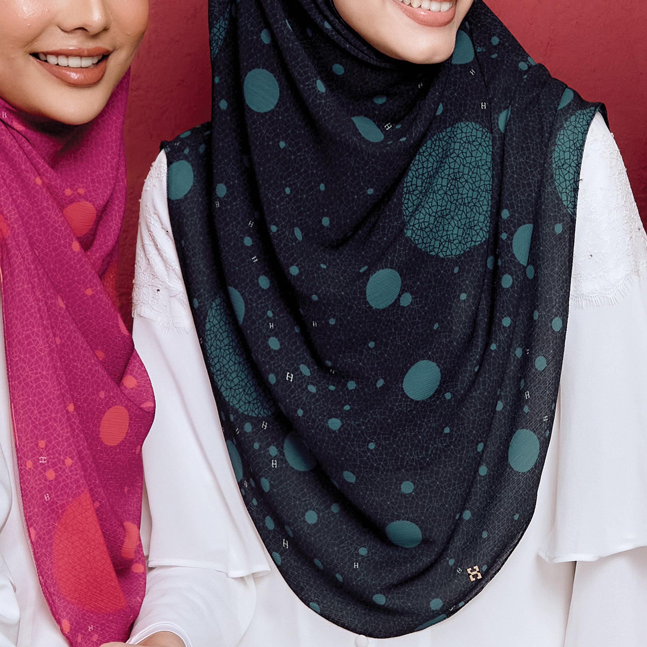 Materials: Body & Awning - Custom Printed Textured Chiffon | There is a layer inside made of Premium Heavy Chiffon to ensure the hijab is not see-through.