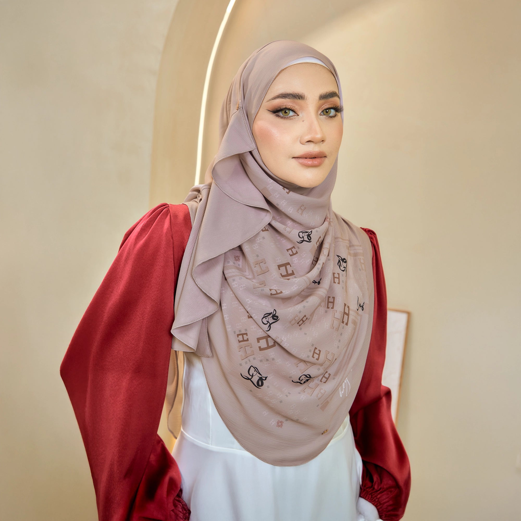 • Themes: A classic monogram hijab with Jawi letters هـ، ج، ر — a touch of heritage in every detail. Made for your busy day, from work to winding down. Stylish, easy and truly you.